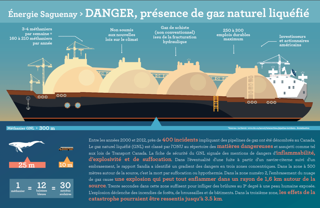 Le projet en bref : Exporter du gaz albertain extrait par fracturation hydraulique en 3 étapes : (1) construire un pipeline de 782 km entre l’Ontario et le Saguenay, (2) construire un terminal méthanier servant à liquéfier le gaz et (3) exporter le gaz par méga navires méthaniers à travers le Fjord du Saguenay et le fleuve Saint-Laurent.