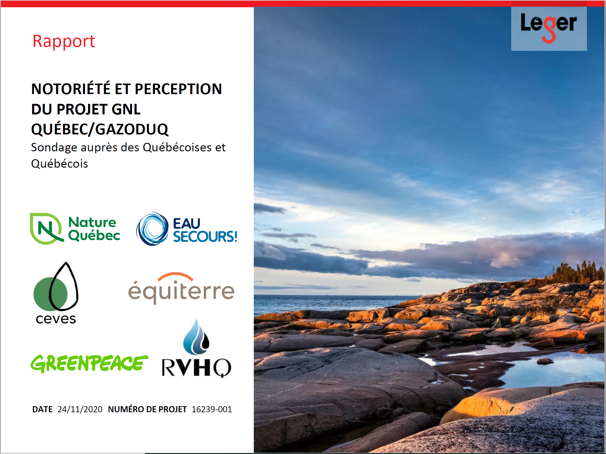 Le 2 décembre 2020, Saguenay. Un sondage réalisé par la firme Léger auprès de 1 000 répondants révèle que le projet GNL/Gazoduq n’a pas d’acceptabilité sociale au Québec. Le sondage a été réalisé du 20 au 22 novembre 2020.