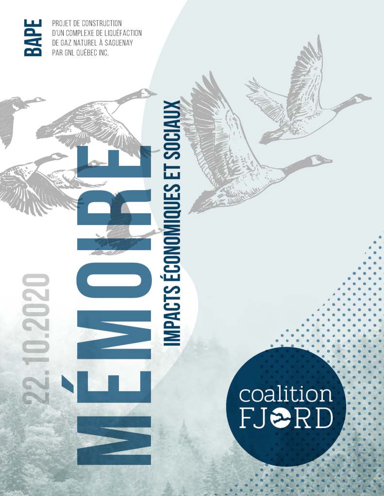 Les nombreux impacts économiques et sociaux exposés dans ce mémoire, démontrent que le projet GNL/Gazoduq va à 1) l’encontre du principe d’efficacité économique selon la Loi sur le développement durable, 2) affecte les dynamiques locales, 3) pose des enjeux politiques et 4) ne prend pas en compte les impacts sur la santé et les impacts psychologiques. Nous appelons à un développement régional porté démocratiquement par les citoyens et citoyennes, favorisant une réelle souveraineté économique. Corédigé par Chantal Goupil et Camille-Amélie Koziej Lévesque, présenté par Chantal Goupil lors de la séance de 19h du 2 novembre 2020.