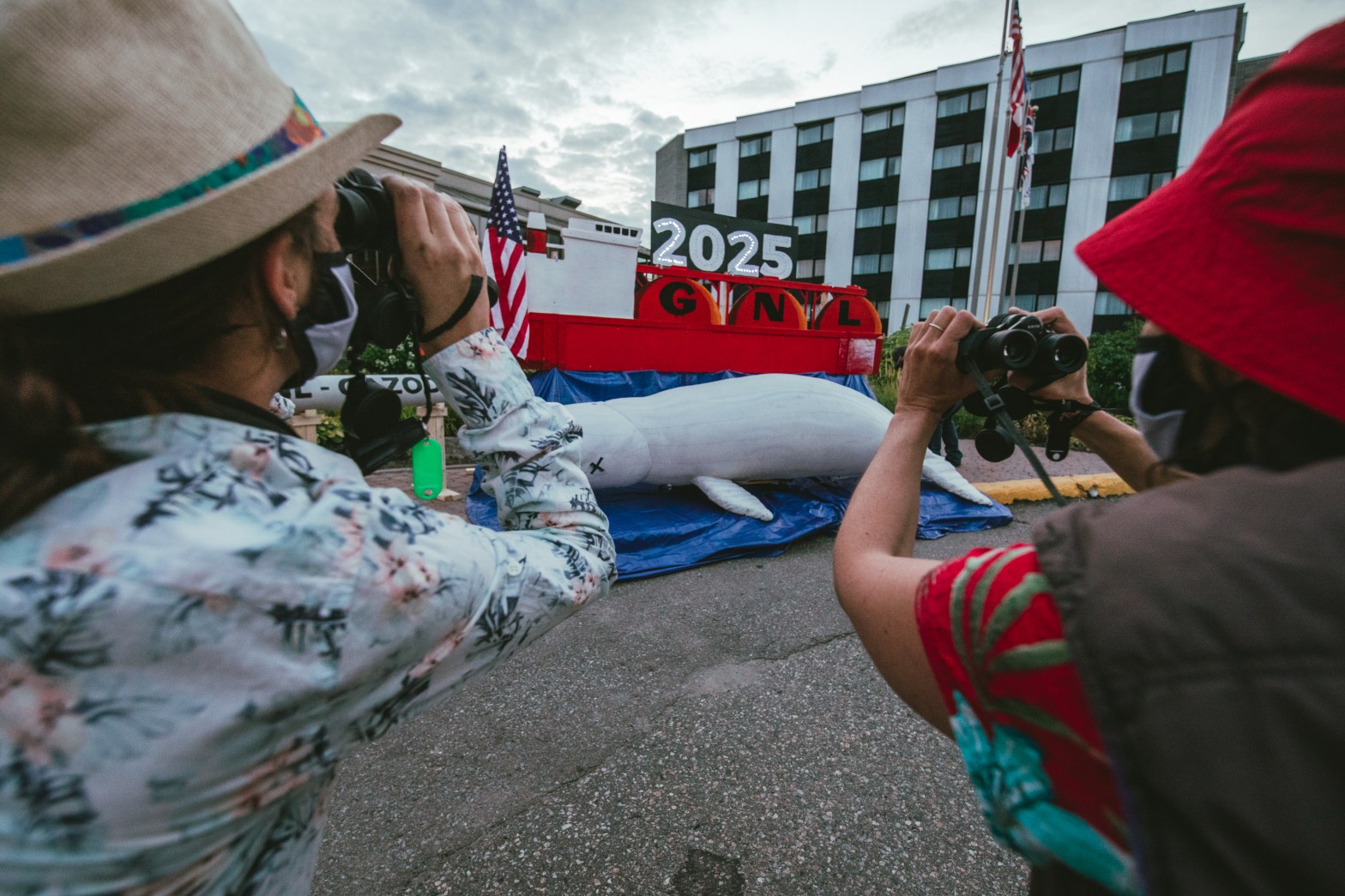 Pour l’ouverture de la première série d’audience du BAPE, une mise en scène satirique nous projette en 2025, où l’observation de méthaniers remplace l’observation de bélugas. L’installation rappelle les impacts irréversibles qu’aurait le projet GNL Québec, notamment sur les emplois locaux du secteur touristique, les émissions de GES et la biodiversité.